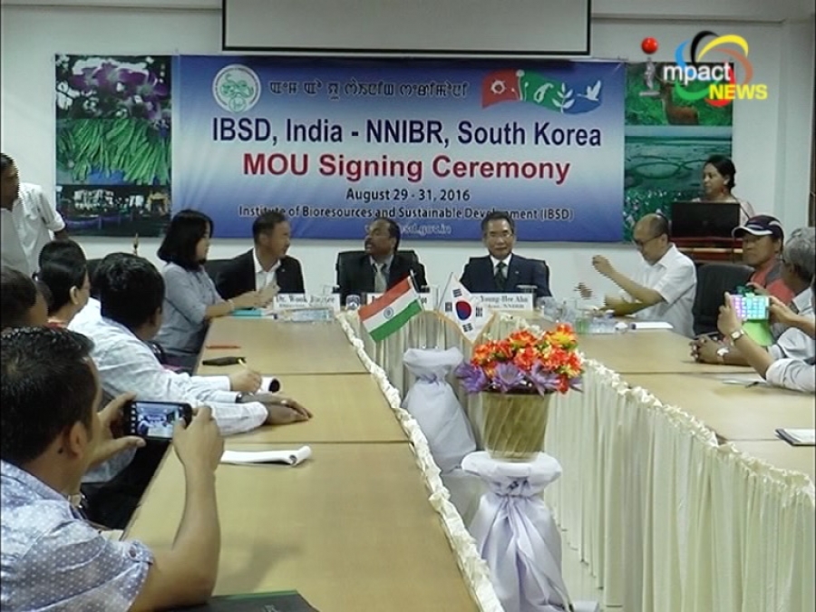 Imphal, 30 August 2016 ( Evening News ) : India and South Korea today signed a memorandum of understanding to help each other in the development of Bio-Resource technology. The memorandum of understanding was signed today between Director of Institute of Bio-resources and Sustainable Development (IBSD), Takyelpat Professor Dinabandhu Sahoo and President of Nakdonggang National Institute of Biological Resources (NNIBR) South Korea, Dr.Young Hee Ahn at a function held at IBSD, Takyelpat. Dr Dinabandhu Sahoo said the MoU will not only help in the development of Research and technology between India and South Korea but also in the development of Bio resources in Manipur. NNIBR Principal Researcher Dr. Namil Chung told reporters that under the MoU, as a first step NNIBR will organise a symposium on Bio Resources in October in South Korea and the scholars of IBSD have been invited. NNIBR Director Dr. Wook Jae Lee, Senior Researcher Dr. Mi Hwa Lee, HT Park and IBSD Reseach Scholars and officials of IBSD attended the event.