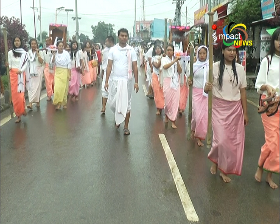 Imphal, 27 August 2017 ( Evening News ) : Commemorating the historic agitation launched by students against the artificial food scarcity in the State on this day in 1965,All Manipur Students’ Union (AMSU) observed the 52nd Hunger Marchers’ Day today. Large number of students today took out a march rally in remembrance of “Chaklam Khongchat”. 4 student martyrs sacrificed their lives on this day in 1965 during the mass uprising against the artificial food scarcity caused by traders from outside the state exporting rice grains from the state. Since then, AMSU has been observing the day as the “Hunger Marchers’ day”. Large number of students gathered at the memorial site of the four student martyrs at Singjamei Chingmacha since early in the morning and began the observance with “Yakairol”. Commemorating the day, leaders of AMSU hoisted the flag of the student's union. Later family members of the students who sacrificed their lives, leaders of AMSU and students paid floral tributes to the portraits of the martyrs Oinam Nabakumar, Laishram Chaobal, Nongmeikapam Pramodini and Waikhom Nilamani. A march rally was then taken out from Moirangkhom road through Keishamthong, chanting various slogans under strict security of the Police personnel and converged on DM College Campus and held a public meeting at Multipurpose Hall of DM college.