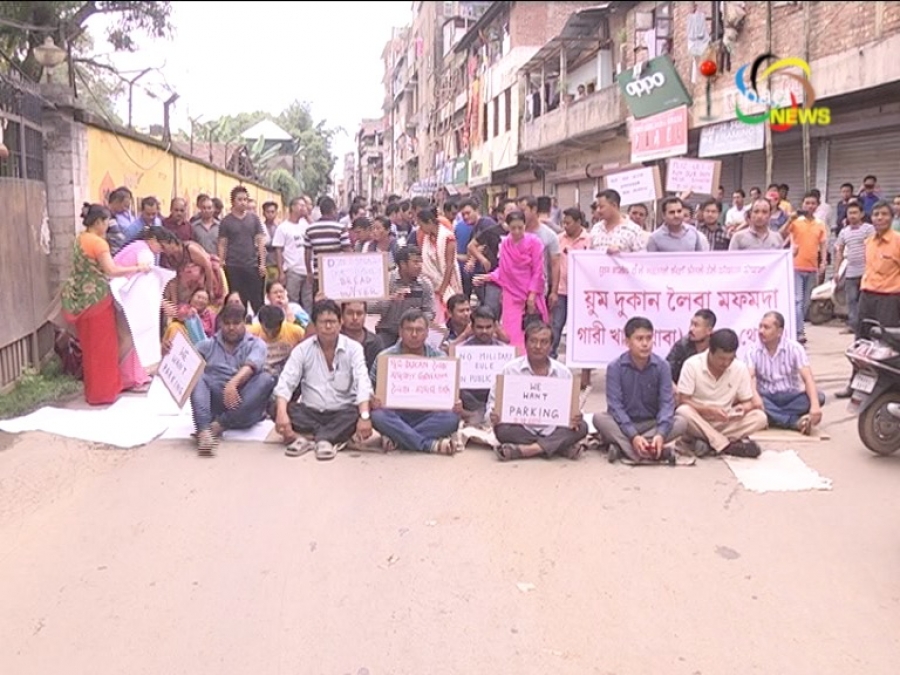 Imphal, 11 October 2016 ( Evening News ) : Residents and shopkeepers along the Governor road blocked the road indefinitely from today.The decision to block the road was resolved as no parking and vehicle were allowed to ply on this road. Residents and shopkeepers holding placards saying 'we want parking lot', 'vehicle should be allowed to enter' and 'don’t snatch our daily bread' were displayed by the protesters. A shopkeeper speaking to Impact News said the decision of the Govt has caused inconveniences to the shopkeepers. The shopkeeper also demanded shifting of governor Bungalow to some other place.