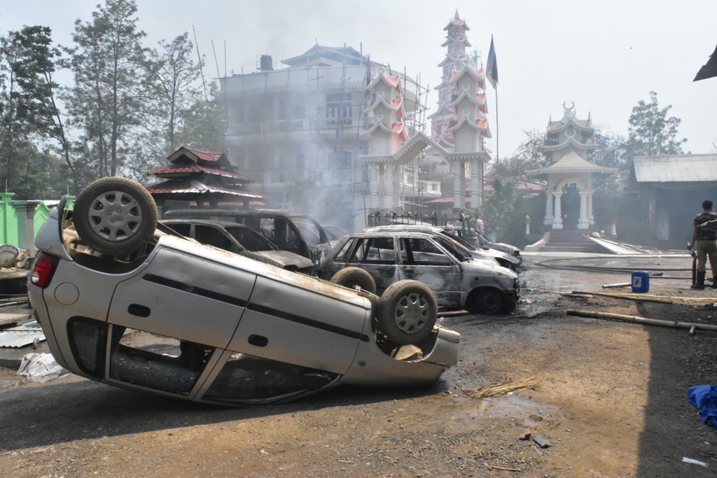 Imphal, 03 May 2016 : Temple complex of Panthou alias Hijam Ratan was today torched by angry locals of Wangkhei Hijam Leirak under the Porompat Police Station, Imphal East. A large number of mob went on rampage damaging property and torching more than 20 vehicles parked inside the temple complex. The incident occurred at around 7.30 this morning when the guardians came to take their wards back home. The guardians told media persons that there was no restriction from the side of the residents of Wangkhei Hijam Leirak to take their wards back home. But tension erupted after a young girl told media persons that there was restriction from the side of the locals which turned out to be the cause of the entire incident today. Ahead of the incident some guardians were successful in taking their wards from the temple complex. Soon after large mob turned up and vandalise properties inside the Panthou's temple complex. The angry mob torched 13 four-wheelers and 7-8 two-wheelers parked inside the temple complex. The mob also torched the hall and other buildings located inside the complex. Following the incident, a large number of Manipur Police personnel arrived at the spot to control the volatile situation. The police personnel could not control the situation as large number of people from other localities rushed to Wangkhei Hijam Leirak. In the meantime fire tenders arrived and tried to doze off the fire. It almost took 2 hours for fire tenders to completely doze off the fire. After some time another police team comprising top police officials of Imphal East rushed to the spot. Soon clash erupted between the large number of police personnel and mob. Police personnel fired smoke bomb, tear gas shells as mob pelted stones at the police personnel. Many locals including police personnel sustained injury during the incident. District Magistrate Imphal East has imposed curfew in Wangkhei Hijam Leirak and Wangkhei Mayum Leirak.